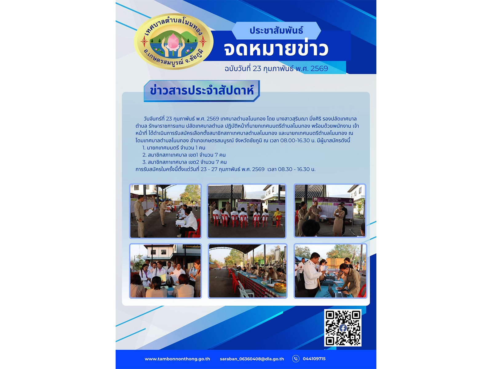 วันจันทร์ที่ 23 กุมภาพันธ์ 2569 เทศบาลตำบลโนนทอง นำโดย นางสาวสุรินณา มิ่งศิริ รองปลัดเทศบาลตำบล รักษาราชการแทน ปลัดเทศบาลตำบล ปฎิบัติหน้าที่นายกเทศมนตรีตำบลโนนทองพร้อมด้วยพนักงาน เจ้าหน้าที่ ได้ดำเนินการรับสมัครเลือกตั้งสมาชิกสภาเทศบาลตำบลโนนทอง และนายกเทศมนตรีตำบลโนนทอง ณ โดมเทศบาลตำบลโนนทอง อำเภอเกษตรสมบูรณ์ จังหวัดชัยภูมิ ณ เวลา 16.30 น. มีผู้มาสมัครดังนี้
