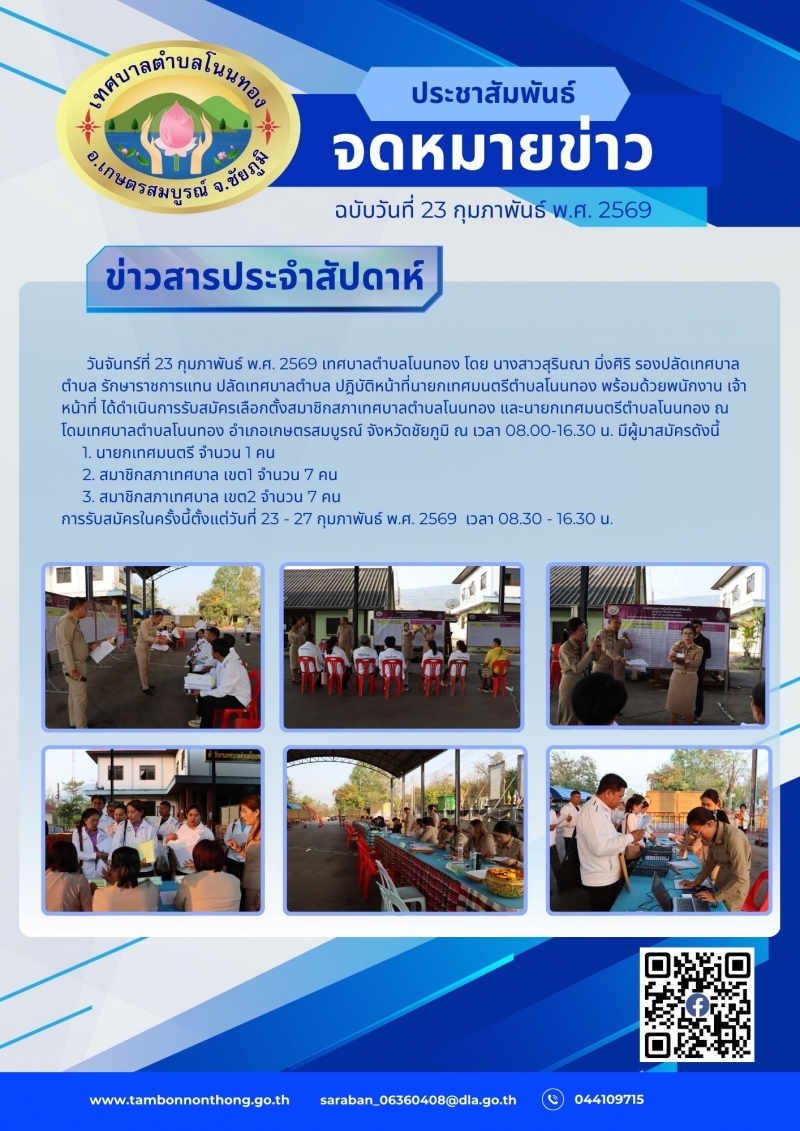 วันจันทร์ที่ 23 กุมภาพันธ์ 2569 เทศบาลตำบลโนนทอง นำโดย นางสาวสุรินณา มิ่งศิริ รองปลัดเทศบาลตำบล รักษาราชการแทน ปลัดเทศบาลตำบล ปฎิบัติหน้าที่นายกเทศมนตรีตำบลโนนทองพร้อมด้วยพนักงาน เจ้าหน้าที่ ได้ดำเนินการรับสมัครเลือกตั้งสมาชิกสภาเทศบาลตำบลโนนทอง และนายกเทศมนตรีตำบลโนนทอง ณ โดมเทศบาลตำบลโนนทอง อำเภอเกษตรสมบูรณ์ จังหวัดชัยภูมิ ณ เวลา 16.30 น. มีผู้มาสมัครดังนี้