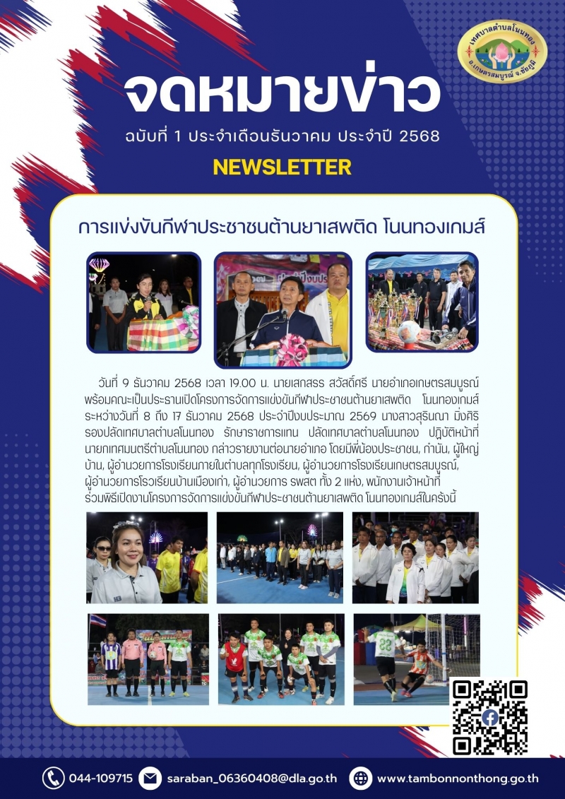 วันที่ 9 ธันวาคม 2568 เวลา 19.00 น. นายเสกสรร สวัสดิ์ศรี นายอำเภอเกษตรสมบูรณ์พร้อมคณะเป็นประธานเปิดโครงการจัดการแข่งขันกีฬาประชาชนต้านยาเสพติด โนนทองเกมส์ ระหว่างวันที่ 8 ถึง 17 ธันวาคม 2568 ประจำปีงบประมาณ 2569 นางสาวสุรินณา มิ่งศิริ รองปลัดเทศบาลตำบลโนนทอง รักษาราชการแทน ปลัดเทศบาลตำบลโนนทอง ปฏิบัติหน้าที่นายกเทศมนตรีตำบลโนนทอง กล่าวรายงานต่อนายอำเภอ โดยมีพี่น้องประชาชน, กำนัน, ผู้ใหญ่บ้าน, ผู้อำนวยการโรงเรียนภายในตำบลทุกโรงเรียน, ผู้อำนวยการโรงเรียนเกษตรสมบูรณ์, ผู้อำนวยการโรวเรียนบ้านเมืองเก่า, ผู้อำนวยการ รพสต ทั้ง 2 แห่ง, พนักงานเจ้าหน้าที่ร่วมพิธีเปิดงานโครงการจัดการแข่งขันกีฬาประชาชนต้านยาเสพติด โนนทองเกมส์ในคร้งนี้